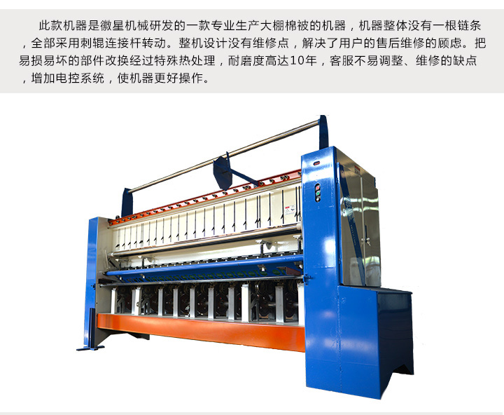 產品簡介:此款大棚棉被機采用針桿獨立運動型棉被機(全名:彈簧壓縮反彈式針桿獨立運動)是由安徽省徽星機械制造有限公司研發生產的新一代棉被縫紉設備。