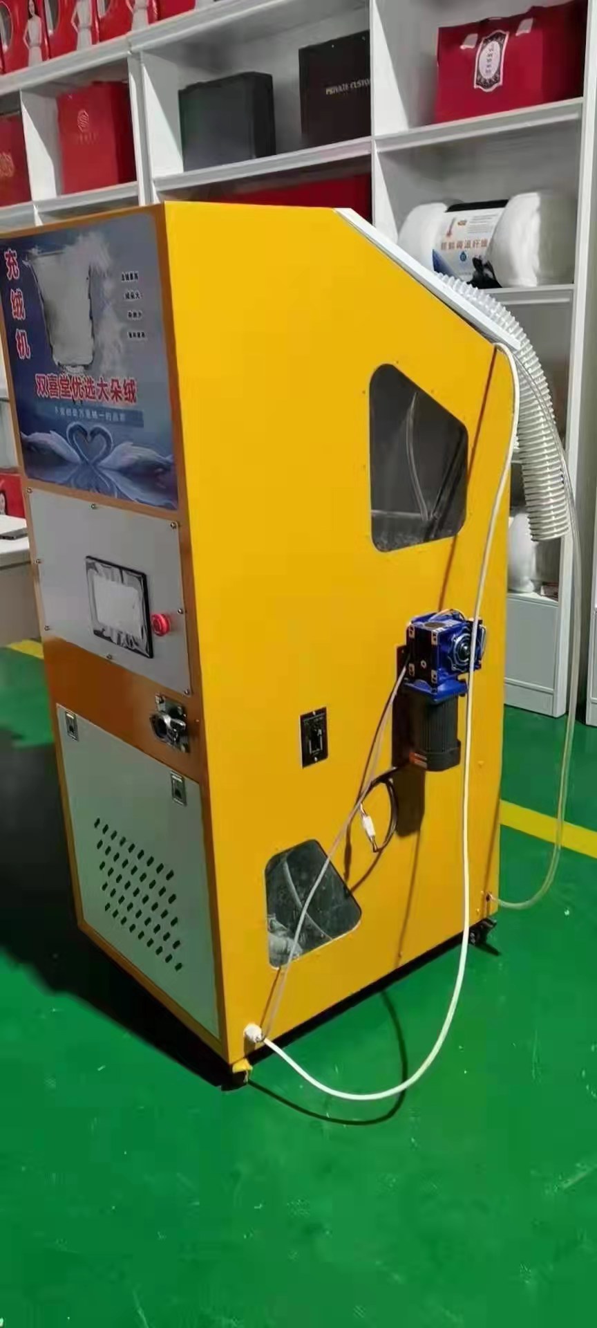 本設備可成功除掉充絨中80%的金屬,該機型100%有效的回收出口中的三絨,確保環境衛生。適合在商店作為羽絨被現充現賣設備。